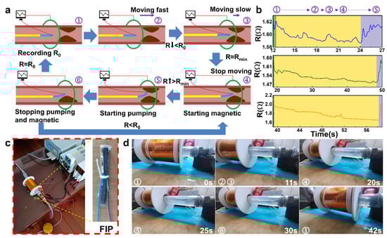The overall workflow of the FIP can be described as follows (Figure 4a). Initially, the front piezo-resistive sensing part is operated to set the initial value, and when the sensing signal is stable, the motion coil is energized and activated, sliding forward to drive the FIP forward rapidly. When the monitoring signal changes (the resistance value decreases), the FIP is approaching the thrombus. The control system controls the size of the coil voltage output and the sliding speed by the degree of signal change, with low voltage, low magnetism, and slow deceleration. When the preset minimum resistance value is reached, it is considered to be close to the thrombus, and the motion coil stops supplying power and movement, activating the deflection coil, which deflects the FIP to make close contact with the thrombus. When the sensing signal value changes (rises), the thrombus has been contacted, and the deflection coil maintains the operating voltage at this point, ensuring that the FIP remains in its current form and is able to complete the corresponding operation in a stable manner. At the end of a cycle of corresponding operations, the deflection coil voltage is removed, and the FIP is returned to its natural state, at which point the sensing signal is monitored and compared to the signal in the absence of a thrombus.
