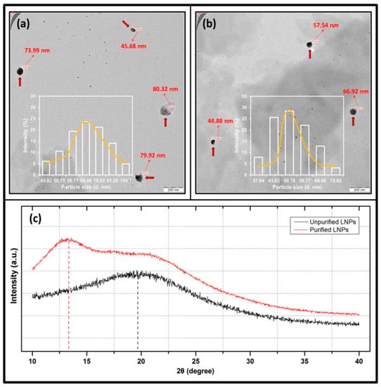 TEM micrograph and particle size distribution of (a) unpurified LNPs and (b) purified LNPs, and (c) XRD patterns of unpurified and purified LNPs.