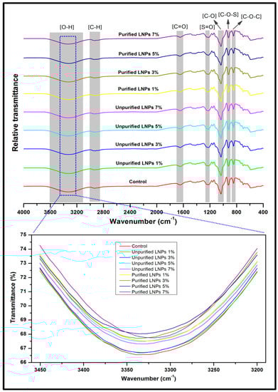Representative data on the surface chemical structure of the control and LNPs/Kappaphycus alvarezii biopolymer films are depicted in Figure 3. According to the FT-IR spectrum, the presence of O–H (hydroxyl) groups stretching the peak of all biopolymer film samples appeared in the broad region peak of 3100–3600 cm−1 [7]. The abundance of the interaction of free O–H groups in the pure film was associated with the hydrophilic nature of the red seaweed. The incorporation of unpurified and purified LNPs caused the absorption peak to shift to a lower wavenumber. However, the lower wavenumber of biopolymer films containing purified LNPs (especially at 5% loading) than neat film and unpurified LNPs films implies that the molecular interaction altered between the purified nanofiller and the seaweed matrix. As a result, the hydrophilicity of the bioplastic films was reduced due to the incorporation of LNPs. Similar findings were also reported by previous studies, where the use of lignin as filler in soy protein [37] and cassava starch [38] could contribute to a reduction of the bioplastic films’ hydrophilicity.