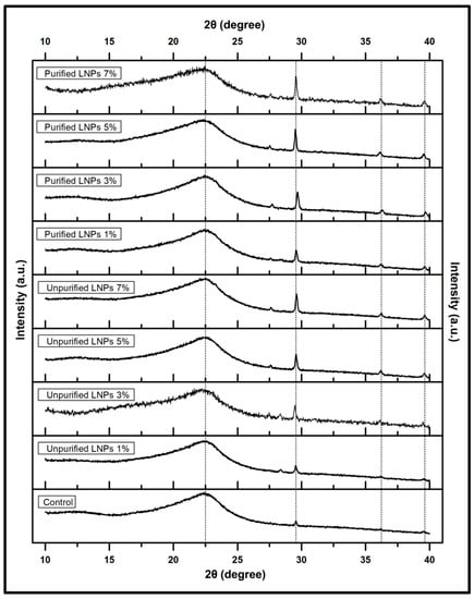 XRD patterns of control film and unpurified/purified LNP-reinforced bioplastic films.