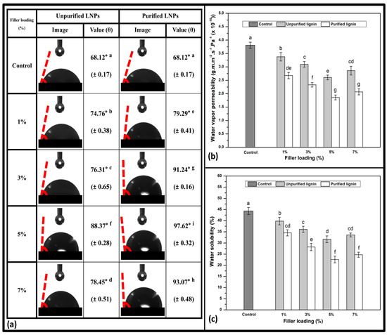 Hydrophobicity and physical properties of (a) contact angle, (b) water vapor permeability, and (c) water solubility of the LNP-reinforced bioplastic films. The same letters above the data bars indicate no significant difference in the values (p < 0.05).