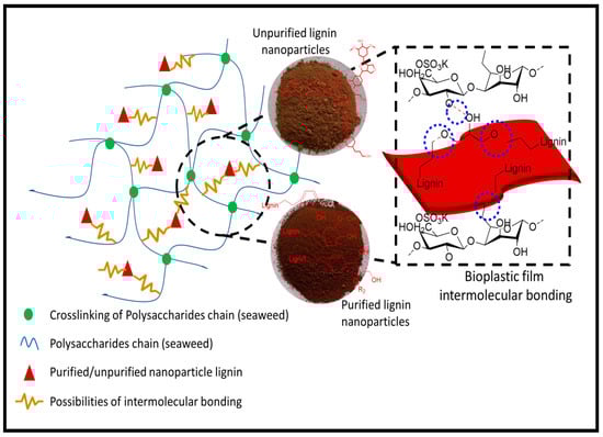 The present work is focused on the preparation and characterization of Kappaphycus alvarezii bioplastic films reinforced by LNPs. The LNPs were isolated from an empty fruit bunch of soda pulping waste. The isolation of lignin from industrial waste is a prime contribution to waste valorization, particularly in the pulp and paper industry. In this study, a novel approach has been proposed to enhance the properties of LNPs through a purification process to eliminate natural impurities such as lipids, waxes, fatty acids, and tannins. The present approach was compared with that of the unpurified LNPs towards the characteristics. These two types of LNPs were then used as reinforcing nanofillers in a Kappaphycus alvarezii matrix. Several techniques and analysis methods investigated the functional properties of the bioplastic film networks. This is the first report on the antimicrobial, water barrier, structural, and biodegradability characteristics of Kappaphycus alvarezii reinforced with unpurified LNPs or purified LNPs. The innovative bioplastic films were also compared with the unreinforced seaweed film to investigate the potential effects and synergisms. The biological test against gram-positive and gram-negative microbes shows that a synergic influence of both types of nanofillers in the matrix networks was achieved, indicating excellent antimicrobial activity against all two bacteria.