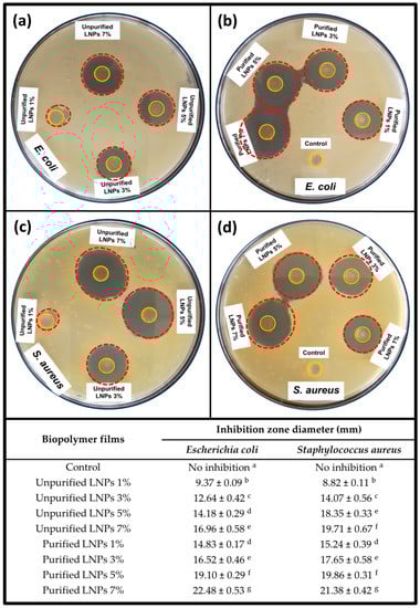 Photographic images and diameter statistics of inhibition zone measurement results of control film and unpurified/purified LNP films at different loadings against (a,b) E. coli and (c,d) S. aureus. Means of inhibition zone diameter followed by different superscript letters indicate significant differences (p < 0.05).