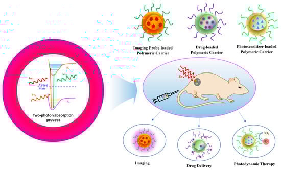 Basic principle of two-photon absorption process. Schematic representations of polymeric carriers loaded with imaging probe or therapeutic agents (drugs or photosensitizer) for two-photon-assisted imaging, drug delivery and photodynamic therapy.