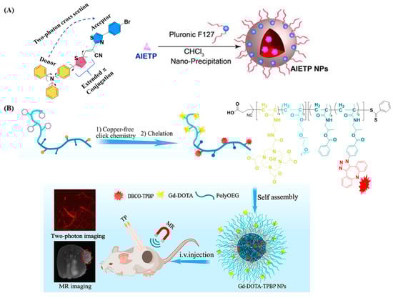 (A) Chemical structure of AIETP probe, and illustration for the preparation of AIETP-loaded Pluronic F127 nanoparticles. Adapted with permission from ref. [30] Copyright 2019 The Authors, Published by Theranostics. (B) Schematic representation of synthesis of amphiphilic block copolymer containing AIE probe TPBP and Gd-DOTA contrast agent for two-photon fluorescence and magnetic resonance imaging. Adopted with permission from ref. [44] Copyright 2022 The Authors. Published by KeAi Communications Co., Ltd.