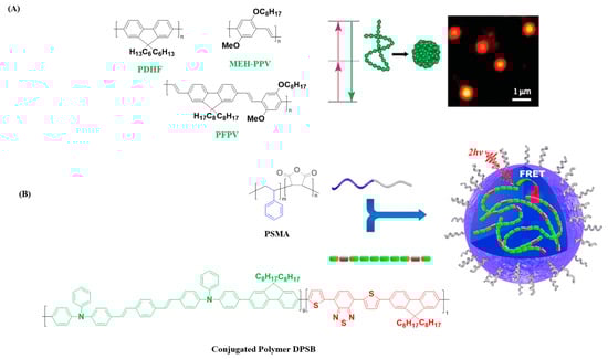 Conjugated polymers (CPs) consist of alternating σ and π-bonds on their polymer backbones, and thus, electrons can delocalize throughout the entire polymer chain, which produces interesting and specific photophysical and electrical properties. Compared to the traditional fluorescence materials, CPs show several distinguished features such as large extinction coefficient, high fluorescence efficiency and excellent photostability. In general, CPs are highly hydrophobic, and thus, to realize these materials for in vivo biomedical applications requires significant improvement of their aqueous solubility. In this direction, the following two strategies have been considered [45]. The first one is formulating CPs into nanoparticles (CPNs) by using nanoengineering techniques or integrating it into amphiphilic block copolymer nanoassemblies using appropriate methods, such as the physical encapsulation method discussed above. The second one is incorporating charged (anionic or cationic) or hydrophilic side chains to the CP hydrophobic backbone. Owing to advantages such as large 2PA cross section, high single-particle brightness, low cytotoxicity and facile surface modification, CPNs have been emerging as promising sensing platforms for both in vitro and in vivo two-photon bioimaging.