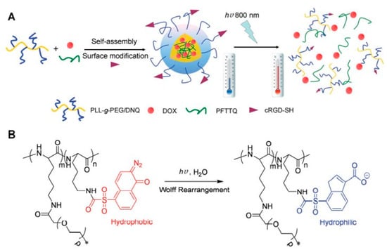 (A) Schematic illustration of preparation of PLL-g-PEG/DNQ nanoparticles and two-photon-mediated disassembly and concomitant drug release, and (B) chemical structure of PLL-g-PEG/DNQ and light-induced Wolff rearrangement. Adapted with permission from ref. [50] Copyright 2015 The Royal Society of Chemistry.