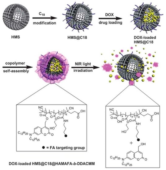 A hybrid coumarin-containing photo-responsive nanocomposite was prepared for NIR light-controlled drug release via a two-photon process [55]. This photo-responsive nanocomposite was fabricated by coating an NIR-light-responsive block copolymer containing photoactive coumarin moiety and tumor-targeting folic acid group onto the surface of DOX-loaded octadecyltrimethoxysilane (C18)-modified hollow mesoporous silica nanoparticles (HMS@C18) through self-assembly (Figure 6). The folic acid moiety conferred selective folate receptor-mediated endocytosis to the nanocomposites, which showed good selectivity to the folate receptor (FR(+)) KB cells compared to FR(-) A549 cancer cells. Because of the high 2PA cross section of the coumarin moiety, the copolymers were disrupted when exposed to NIR femtosecond laser (800 nm), leading to the triggered release of DOX over the targeted tumor cells. Greater than 50% of the DOX loaded on the nanocomposites was released upon NIR light irradiation.