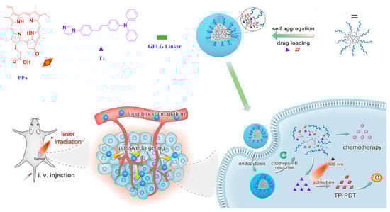 Preparation of cathepsin B-responsive dendritic prodrug and dendritic-[(GFLG-polyPTX)-block-polyOEGMA]. The self-assembled dendritic prodrug is loaded with TPA and PPa, leading to synergistic effect of chemotherapy and two-photon photodynamic therapy for breast tumor. Adapted with permission from ref. [66] Copyright 2021 Elsevier Ltd.