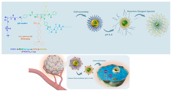 Schematic illustration for preparation of polymeric prodrug PMMTAb-Cap micelles with two-photon bioimaging, pH-triggered size shrinkage and charge-reversal, and ROS-triggered drug release. Adapted with permission from ref. [70]. Copyright 2019 American Chemical Society.
