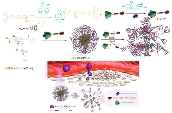 Schematic illustration of TPCDP@PMM theranostic micelles preparation and its responsive behaviors under overexpressed ROS and rich lipid. The TPCDP@PMM is designed to realize ROS-triggered micellar dissociation, rich lipid mediated drug Pred release and two-photon AIE imaging, which result in anti-tumor activity, lipid removal and clear dimensional two-photon imaging of atherosclerosis plaques. Adapted with permission from ref. [75]. Copyright 2020, Wiley-VCH GmbH.