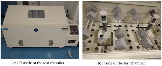 During the test, we used a large salt spray corrosion test box produced by Wuxi Yingbai Technology Co., Ltd. (Wuxi, China), as shown in Figure 1. When the erosion had taken place for the specified period (7 d, 14 d, 28 d, and 90 d), the cube test block was taken out and wiped clean, and the compressive strength, splitting tensile strength, erosion depth, and erosion ion concentration were determined. The process of determining erosion depth and erosion ion concentration was as follows: