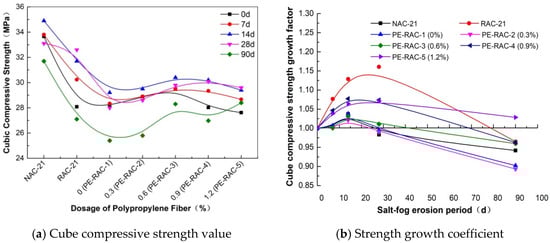 (1) At the same erosion age, the compressive strength and splitting tensile strength increased first and then decreased with the increase in fiber content, and the peak point was 0.6–0.9%. Meanwhile, each strength index first increased and then decreased with the increase in the salt spray erosion time. When the erosion time was 14 d to 28 d, its peak coefficient reached the maximum value.