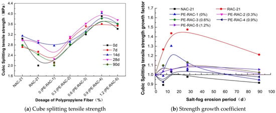 Figure 3 displays the change rule of splitting the tensile strength of waste fiber content at different erosion ages. Compared to the good tensile effect and toughening effect of waste fiber, its effect on tensile strength was more significant. It can be seen from Figure 2a that the tensile strength was at its maximum with the mixing amount of 0.6~0.9% at each erosion age, which was higher than the mixing amounts of 0.1% and 0.12% reported in the literature [,], but the same change rule existed. When its content changed from 0% to 0.9%, the strength also increased by 83.8% (0 d), 71.6% (7 d), 45.3% (14 d), 80.5% (28 d), and 89.9% (90 d), respectively; this effect was quite obvious. In Figure 2b, except for RAC-21 and PE-RAC-1, the increase coefficients are all below 10%, indicating that the increase ratio of tensile strength caused by salt spray erosion was relatively small. Similar to the impact of tailings, the peak point of concrete with large porosity occurred after 28 d of erosion. Due to the soft texture of waste fiber, the pore pressure caused by salt crystallization could be relieved and transferred, meaning the effect of erosion age on the waste fiber was relatively slight, which is visually shown by the curve after the peak point in Figure 2b, which was close to a straight line.
