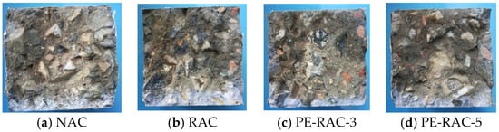 In accordance with the previous research results relating to the coarse aggregates used [,,], the amount of recycled aggregate and iron tailings in the mixture was set to 30%, and the mix proportion was designed according to the previous literature [,]. The water–cement ratio and sand ratio were set to 0.4 and 0.35, respectively. The polypropylene fiber content was set to 0%, 0.3%, 0.6%, 0.9%, and 1.2%. Natural aggregate concrete (NAC) and recycled aggregate concrete (RAC) were used as reference blocks. After a trial mixture was made and adjustment was carried out, the proportions of the mixtures of concrete under various working conditions were determined and are shown in Table 1.