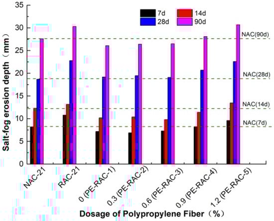 The erosion depths of salt spray under different erosion cycles are shown in Figure 4 and Figure 5. It can be seen that the longer the salt fog erosion took place, the greater the erosion depth was. With the increase in fiber content, the erosion depth decreased first and then increased, but the increasing trend was different. When the fiber content was 0.6%, the erosion depth reached its minimum. This phenomenon was similar to that observed in the literature []. Taking 90 d of erosion as an example, the depth increased by 1.53%, while the content increased from 0% to 6%. The main reason for this was that the fiber displayed two effects. On the one hand, it had an obvious pulling effect, which meant the concrete could resist the expansion force generated by some salt crystallization. On the other hand, it increased the contact area between different materials, which would lead to an increase in porosity to some extent. When the dosage was small (≤0.6%), it had little effect on the erosion depth. However, when the dosage changed from 0.6% to 1.2%, the erosion depth increased by 16.29%, indicating that when its dosage was large, the increasing effect on the porosity of concrete was also greater.