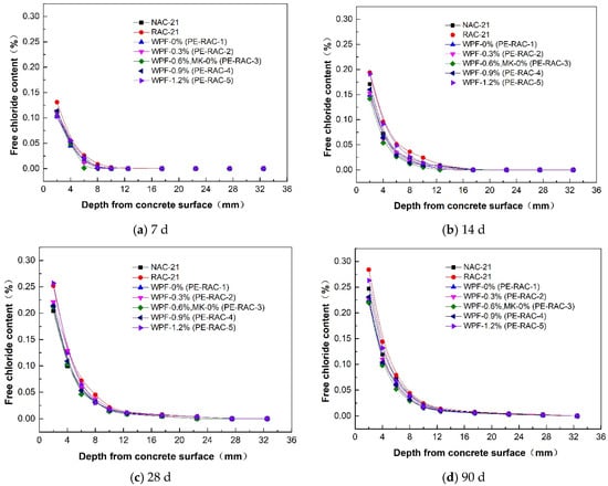 In the test, the salt spray erosion concentration outside the concrete remained constant, the chloride concentration inside the concrete gradually increased with time, and it also decreased with the increase in the distance from the concrete surface. Figure 6 displays the distribution of free chloride concentration at each age under the action of waste fiber.