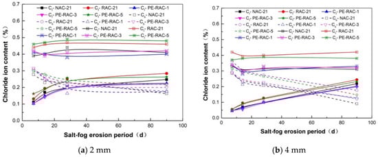 Figure 8 shows the relationship between free chloride ion and total chloride ion concentrations under different levels of waste fiber content. Due to the “wick effect” of concrete [], the concentration of chloride ions gradually decreased with the penetration depth and slowed down when it dropped to a certain depth. Under the action with the concentration gradient of concrete, it gradually diffused into the concrete, but as it was limited by the diffusion resistance of particles and the friction resistance of pores, the diffusion rate of concrete was low []. Therefore, stepped numerical points appear in Figure 8a,c. With the change in aggregate type and fiber content, the pore structure and porosity of concrete also varied, which resulted in the change in free chloride ion and total chloride ion content in the same erosion cycle. The addition of fiber can effectively alleviate the expansion pressure caused by pore salt crystallization and delay the development of micro-cracks inside the specimen. The larger pores in the surface layer provided space for chloride adsorption, the internal micro-cracks supplied channels for chloride transport, and the specific change rules were also different under diverse dosages. However, different erosion ages were influenced by factors such as porosity, diffusion time, and salt crystallization pressure [,] and changed the chloride concentration, which led to the changes shown in Figure 8b,d.