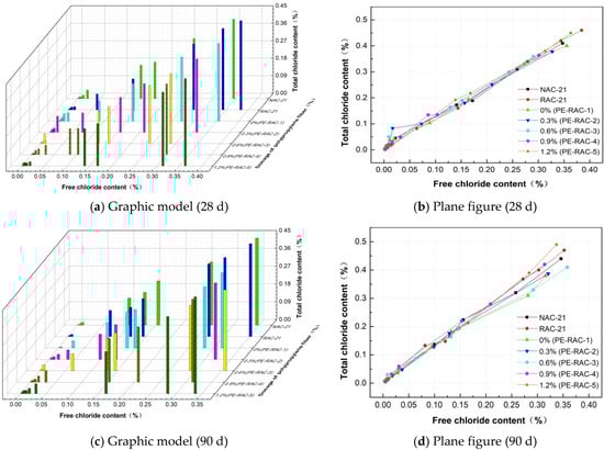 Overall, the curves in the figure displayed above can be divided into two categories according to the value: one was NAC and the concrete with 1.2% fiber content (PE-RAC-5), and the rest were divided into the other category. The porosity of recycled concrete was improved due to the addition of tailings, meaning the chloride ion content of TRC (PE-RAC-1) with 0% fiber content was lower than that of RAC. The addition of appropriate fiber did not change the matrix structure of TRC too much. Therefore, the TRC with 0.6% fiber content (PE-RAC-3) differed little from PE-RAC-1 and NAC. To be specific, the addition of fiber did not affect the alkalinity of cementitious materials. The higher the fiber content was, the larger the contact area between the fiber and the concrete materials was, and the greater the porosity was. Therefore, the free chloride ion (Cf) and total chloride ion (Ct) contents of PE-RAC-3 were slightly higher than those of PE-RAC-1. Due to the spatial network distribution of waste fibers in concrete and the accumulation of fibers in different directions, the porosity increased greatly when waste fibers were overdoped (PE-RAC-5). Therefore, the free chloride (Cf) and total chloride (Ct) contents of PE-RAC-5 were equal to or even higher than those of RAC. At the same time, the greater the distance from the concrete surface, the later the position started to consume C3A, meaning the time when Cf and Cb were equal appeared later; these results are similar to those of Niu [].