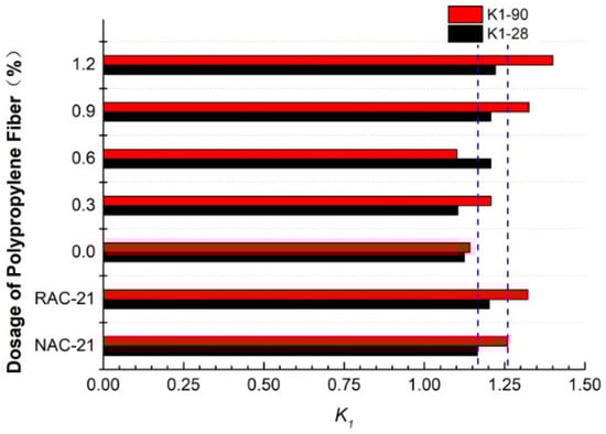 Figure 9 demonstrates the comparison of curing coefficients with different levels of fiber content. It can be seen that when the fiber content was low (≤0.6%), there was no significant difference in the curing coefficients of different levels of fiber content due to the activity of tailings and the increase in porosity caused by fiber. However, when the amount of waste fiber was large, the space grid effect of waste fiber became significant, which made the pore structure in TRC coarser; the gross pores increased greatly [,]; the specific surface area became larger, and the physical adsorption of chloride ions was greater. The different levels of fiber content had no influence on the alkali composition of concrete due to the absence of additional active materials. In general, when the content of waste fiber was high, the curing effect on chloride ions became stronger. This was also the main reason why the chloride ion curing capacity of 28 d and 90 d corroded concrete changed by −5.19%, −5.14%, 4.82%, and 11.20%, respectively, compared with NAC when the fiber content was increased from 0.6% (PE-RAC-3) to 1.2% (PE-RAC-5).