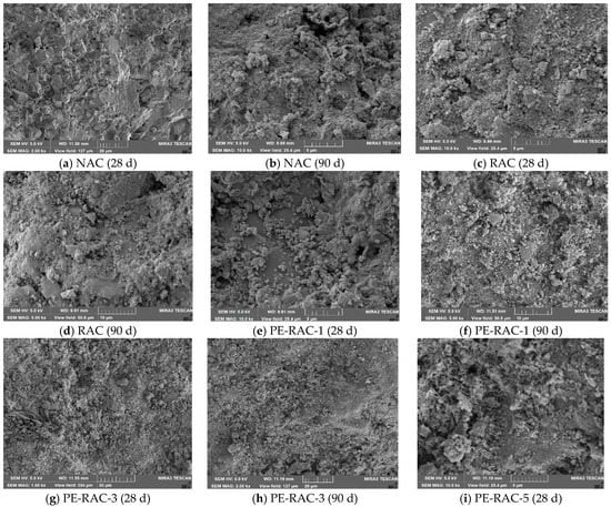 When the erosion age was longer (90 d), it can be clearly seen that there was a significantly larger number of pores and micro-cracks in the concrete matrix structure than those in the working condition with shorter erosion ages (28 d), as shown in Figure 10b,d,f,h,j, which shows that when the erosion time was longer, the matrix structure of concrete was also damaged with the accumulation of salt crystals. The reason for this was that, on the one hand, the physical expansion of chloride crystals that accumulated in the pores made the matrix structure produce tensile stress and made it easy to crack; on the other hand, there was relatively little free water in the concrete, and the generation of cement hydration and chloride crystals needed to consume free water, resulting in adverse effects on the matrix structure due to water migration. In conclusion, the mechanical properties and durability of almost all working conditions decreased by varying degrees when the erosion age was longer. Xue [] and Yue [] reached similar conclusions in their research.