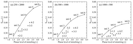 Nematic order parameter for different levels of uni- and biaxial stretching plotted over the planar level of stretching. All systems are stretched at a temperature of 500 K. (a) system size: , (b) system size: , (c) system size: . The data points for the uniaxially stretched systems are connected as a guide to the eye. Inserts denote the levels of stretching for each data point. Error bars are smaller than symbols.