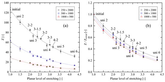 Furthermore, we compare the number of entanglements per chain Z with the planar degree of stretching. Figure 3 shows that an increasing level of uniaxial stretching leads to a rapid decrease in the number of entanglements. In the case of biaxial stretching, Figure 3 reveals that the main stretching direction dominates disentanglement behavior. The systems that were stretched by a factor of 3 in the major stretching direction (uni 3; 3-1.5; 3-2) in particular demonstrate this effect: Starting at the uni 3 system, additional biaxial stretching leads to a mild decrease in the number of entanglements only. A strong level of stretching of 3-3 is needed to induce a larger decrease in the number of entanglements. Moreover, the number of entanglements for the uni 4 and 4-2 systems are on a very close level. However, the biaxially stretched system is clearly deformed to a higher extent than the uniaxial system. From Figure 3, it is obvious that these findings are valid for all investigated chain lengths. Nevertheless, due to the lower number of entanglements per chain for short chains, the observed absolute effects (Figure 3a) are less prominent. Normalizing the corresponding results (Figure 3b) reveals that the relative changes are on a very similar level.