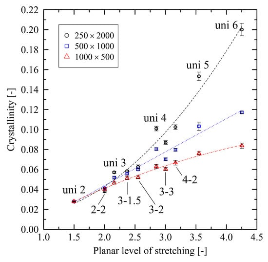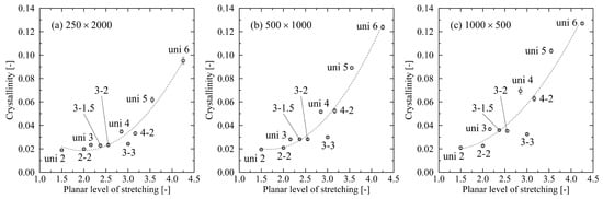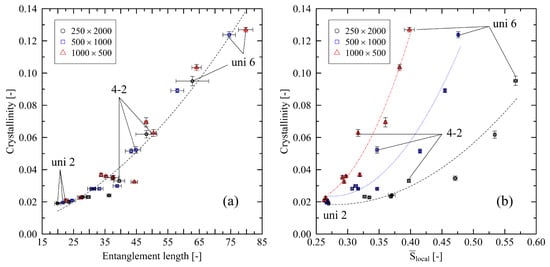 Considering biaxially stretched systems, Figure 6a reveals that in the case of the relationship between entanglement length and degree of crystallinity results fall in line with the purely uniaxial investigations from Figure 5. In addition, it can be noted that entanglement length and crystal size are associated with each other. An increase in the entanglement length leads to larger average crystal sizes. For example, in cases of the system, average crystal size (determined according to our methods described in [24]) increases almost linearly by a factor of from the lowest (uni 2) to the largest (uni 6) investigated level of stretching. This also holds for the investigations under free conditions (cf. Section 3.3) but with a lower increase in the crystal size by a factor of .