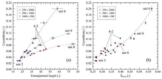 Clearly, a correlation of the entanglement length after stretching and the resulting level of crystallinity exists (Figure 5a). More extensive entanglement lengths (less entangled chains) allow the chains to reach a higher level of crystallization. Interestingly, at the same level of entanglements, long chains have a significantly higher level of crystallization than short chains.