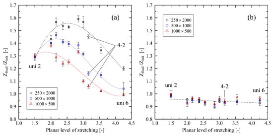 Ratio of number of entanglements per chain Z at the end () and at the beginning of the cooling stage () for different system sizes (). Data are plotted over the planar level of stretching. (a) Results for free conditions, (b) results for fixed conditions. The figures include data points for all biaxially stretched systems (2-2; 3-1.5; 3-2; 3-3; 4-2) and uniaxially stretched systems (uni 2; uni 3; uni 4; uni 5; uni 6). The dotted lines in (a) represent third-order polynomial fits for each investigated chain length. In (b) the dotted line is a linear fit over all data points. All fits are a guide to the eye only.