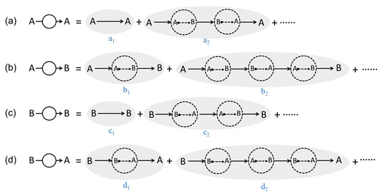 For diagrams and (Figure 1a,c), reversing the directions of all the sub processes results in the same diagram. For example, we will still obtain the diagram after reversing the directions of the diagram. Therefore, and are symmetric in this respect.