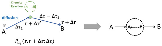 In the present binary system undergoing chemical reactions, there are mainly four physical processes as shown in Figure 1, (a) diffusion of an A molecule from to within a small time span , (b) an A-type molecule turns into a B-type molecule through chemical reaction, (c) diffusion of a B molecule, and (d) a B-type molecule turns into an A-type molecule. Just as pointed out in the introduction section, each of these physical processes is not just a single process but actually represents a group of physical processes.