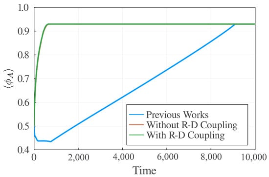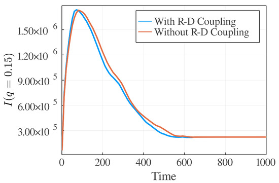 Comparision between the dynamic equations with (Equations (23) and (24)) and without (Equations (25) and (26)) reaction–diffusion coupling terms by showing their light scattering functions at different time steps at a fixed q. The numerical simulation is performed on a lattice. , , , , and . The light intensity at is evaluated by .