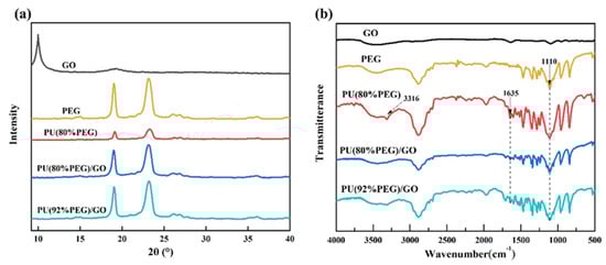 Figure 2a shows the XRD patterns of PU and PU/GO composites. The high diffraction peaks at 2θ = 19.1° and 23.2° indicate the good crystallinity of PEG. After the reaction of PEG and MDI, the deceased intensity of the diffraction peak of PU(PEG80%) indicates that the crystallinity becomes lower. When GO was added into PU(PEG80%), the intensity of the diffraction peak increased obviously, which indicates that the crystallinity is improved. This is mainly because some functional groups of GO interact with MDI which reduced the crosslinking degrees of PU. In addition, the crystallization of PEG may be influenced by the crosslinking degrees of PU [27]. PU/GO exhibit all the characteristic peaks of PEG, but no new diffraction peaks appear. The results indicate the addition of GO is the only physical modification, and no new substance is produced. The structure of GO, PEG, PU and PU/GO composites confirmed by the FT-IR method are shown in Figure 2b and Table 2.