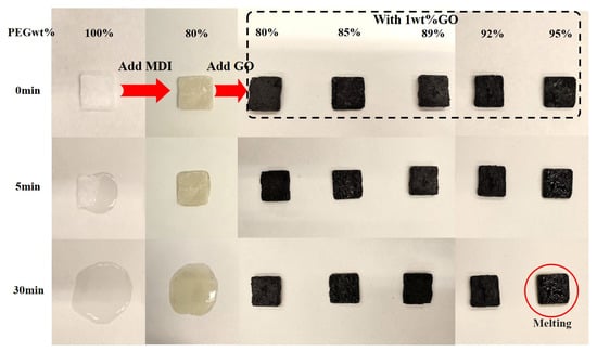 Digital images of PEG, PU and PU/GO at 80 °C for 30 min.