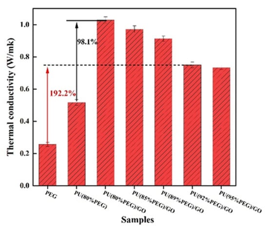 Figure 7 shows the thermal conductivities of PU and the composite PCMs. The thermal conductivity of PU(PEG80%)/GO is 1.03 Wm−1 K−1, which shows relative enhancement of 98.1% compared with PU(PEG80%). This is because that the isocyanate in MDI is covalently grafted with GO to greatly improve the thermal conductivity of PU. The thermal conductivity of the composite PCMs gradually decreased as the PEG content increased. This is mainly because the low thermal conductivity of PEG (0.251 Wm−1 K−1) and the addition of much PEG leads to an increase in the voids of the composite material, which increases the interfacial thermal resistance and leads to a decrease in thermal conductivity. When PEG content is 92 wt%, the thermal conductivity of PU/GO can also reach as high as 0.751 Wm−1 K−1, which is also 192.2% higher than that of PEG.