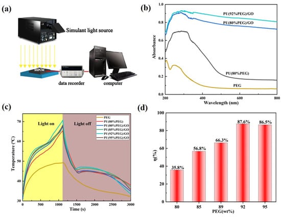 (a) Experimental diagram of photo–thermal energy conversion and storage test system; (b) absorption spectrum of PEG, PU and PU/GO; (c) temperature–time curves of PU/GO under simulated solar radiation at 100 mW/cm2; (d) photo–thermal conversion efficiency for PU/GO doped with different contents of PEG.