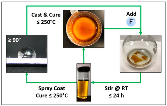 The processes of catalytic depolymerization of polysiloxanes are of particular interest for crosslinked systems formed in the presence of tri- and tetrafunctional silanes, which form the corresponding crosslinks. Such thermosetting silicone rubbers have improved heat resistance and other advantageous properties, but are particularly difficult to recycle. In this case, reversible de-linking, re-molding, and re-crosslinking appears to be the ideal strategy for recycling highly crosslinked silicone rubbers. An example of such a process was given in Ref. [30]: in this work, silicone rubber was dissolved in THF containing fluorine ions (tetrabutylammonium fluoride, TBAF, served as the source of F−). The presence of fluoride ions in THF leads to the complete dissolution of silicone rubber in this system. The resulting solution was applied to the surface by spraying, after which it was subjected to heat treatment, which led, after removal of the solvent, to the recovery of the polymer network and the formation of a superhydrophobic crosslinked silicone coating (Figure 4).