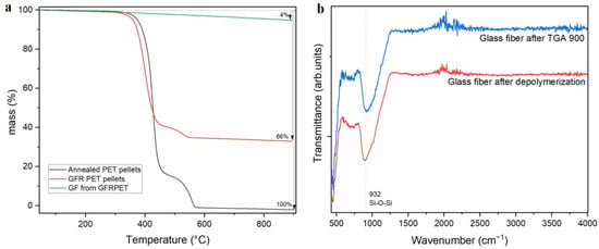 (a) TGA of the glass fiber, of pristine PET and of GFR PET composite. (b) FTIR spectrum of the glass fiber after incineration at 900 °C and after full depolymerization of the composite.