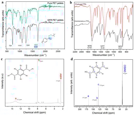 (a) FTIR of the starting material (GFR PET pellets) compared to pristine PET pellets. Zoom-in on the region from 500 to 2500 cm⁻1. (b) FTIR of obtained TPA compared to commercial TPA. (c) 1H-NMR spectrum of obtained TPA. (d) 13C-NMR spectrum of obtained TPA.