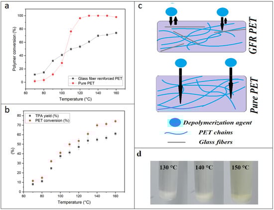 PET depolymerization using the KMH system has been previously described as an efficient and promising method to achieve almost instantaneous depolymerization of PET flakes from bottles. In the present study, we observed that glass fibers slow down PET depolymerization by the KMH solution. First, we observed that the same conditions that led to total depolymerization of PET flakes (120 °C, 1 min) barely worked for the composite. Figure 3a displays PET conversion as a function of depolymerization temperature in reactions carried out for one minute for GFR and pure PET pellets while all other parameters remained identical. By comparing the depolymerization behavior of pure and GFR PET pellets, a significant “protection” of the PET chains by the glass fibers can be inferred. This “protective effect” is more evident above 100 °C. As a result, the profiles for depolymerization of GFR and pure PET pellets are different: for the pure pellets, above 100 °C there is an inflection point, reaching almost full conversion at 120 °C, whilst the GFR pellets present a linear increase of polymer conversion with increasing depolymerization temperature. Therefore, no full conversion after one minute reaction was achieved for GFR PET pellets, regardless of the reaction temperature applied. In Figure 3b, the PET conversion and TPA yield are plotted. The TPA yield turned out to be lower than the conversion, which is expected due to mass loss in the precipitation and filtration steps [4,6]. The lower TPA yield at high temperatures (higher than 150 °C) might be explained by possible degradation. It was observed that the reaction mixture remained white up to 140 °C, but became yellow from 150 °C, which could indicate degradation (Figure 3d). This must be taken into account at the moment of planning an industrial depolymerization process where high energy efficiency is desired, and the temperature in a larger reactor may not be as controlled as in the small reactor vials used in the lab environment.