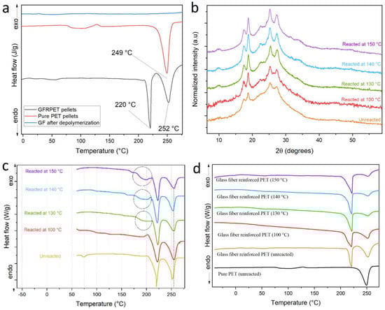 The apparent increase in crystallinity could be explained by the two aforementioned reasons. It is also observed that a secondary peak starts to be formed at 2θ = 34° for temperatures above 130 °C. This new diffraction peak, not present in the original unreacted pellets, could be the consequence of a synergy between high chain mobility at high temperatures (above its glass transition temperature), surface-induced crystallization effects, and the high pressure of the system, which could result in a crystalline structure absent in the unreacted composite. To look for other evidence of this possible crystalline structure, DSC was performed on the same samples and the results are displayed in Figure 4c,d, where the first and third heating cycles are displayed and compared to pure PET for comparison. First of all, the composites show two melting peaks, the first at around 220 °C, and a second melting process that reflects the melting of PET chains at around 250 °C. In Figure 4d, the third cycle shows that the melting peak corresponding to PET diminishes its area with respect to the area of the peak at 220 °C, which remains constant. These findings suggest a likely surface adhesion of PET chains to glass fiber and further crystallization. Because of the proximity to glass fibers, those chains are less exposed to KMH, and thus less prone to react as verified by the constant relative area of the peak at 220 °C (ascribed to surface-crystallized chains) compared to the one at 250 °C (corresponding to the regular PET chains crystals).
