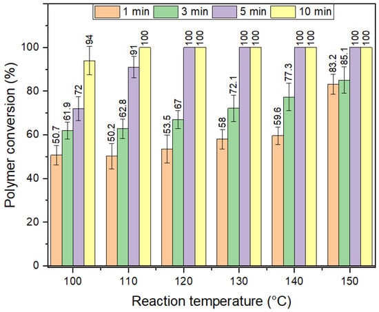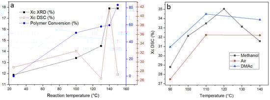 The trend of crystallinity with reaction temperature is visualized in Figure 5a; the polymer conversion and crystallinity index estimated by XRD and DSC are displayed as a function of temperature for pellets reacted with KMH solution for 1 min. It is evident that the combined effect of temperature and depolymerization of the amorphous segments caused a marked increase in crystallinity. However, the crystallinity for pellets reacted at 150 °C is lower than crystallinity values obtained for pellets reacted at lower temperatures. It is likely that at 150 °C, more of the crystalline material is being reacted as a result of increased chain mobility at higher temperatures and an increased reaction rate. However, this should not be used as a reason to depolymerize this composite at 150 °C, as it has been observed that this higher temperature could lead to the degradation of reaction products (vide supra). The values of the crystallinity index determined here by XRD and DSC are consistent with the findings in literature [13,14,15,16,17,18,22,23].