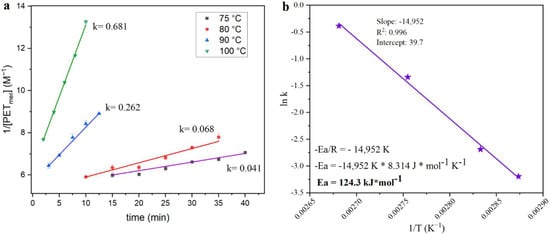 (a) Reciprocal concentration of the PET-mer as a function of reaction time for depolymerization of GFR PET pellets with KMH solution. (b) Arrhenius plot for the depolymerization of GFR PET pellets.