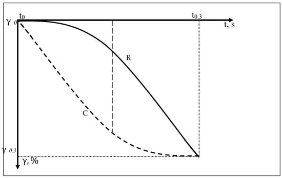 The physical parameters of a layered rubber–fabric composite and its ability to recover under high-frequency compression can be described using the Kelvin–Voigt viscoelastic body model. The model consists of parallel connected elements: elastic (with elastic modulus E) and viscous (with viscosity coefficient η). The relaxation time of this system is expressed by the equation [24,25]: