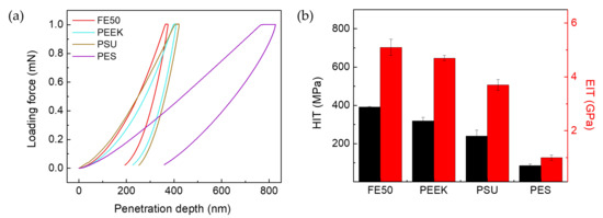 | Sample Designations | Tensile Strength [MPa] | Elongation at Break [%] | Young’s Modulus [GPa] | HIT a [MPa] | EIT b [GPa] | Tgc [°C] |