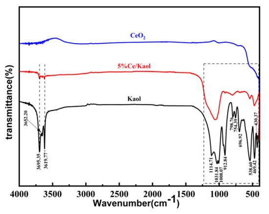The FT-IR spectra of Kaol and CeOx/Kaol material are displayed in Figure 2. In the high wavenumber region, there are two obvious bands at 3695.35 cm−1 and 3619.77 cm−1; these were attributed to the stretching vibration of inner surface hydroxyl and inner hydroxyl, respectively [36,37]. In the medium wavenumber region, the three bands at 1114.71 cm−1, 1031.84 cm−1, and 1008.07 cm−1 presented favorable separation, which are associated with the stretching vibration of Si-O in the silica tetrahedron, which indicated that the Kaol sample presented a high crystallinity and had an agreement with the XRD data [38,39,40]. In the low wavenumber region, the band at 914.7 cm−1 is attributed to the bending vibration mode of Al-OH. The bands observed at 541.4 cm−1 and 472.5 cm−1 are attributed to the bending vibration of Al-O-Si. With the loading of CeOx, the intensities of characteristic bands for hydroxyl groups decreased significantly in the high wavenumber. Meanwhile, in the middle wavenumber, a wide band was observed approximately at 1000 cm−1, which is attributed to the stretching vibration of Si-O and indicated that the crystallinity of Kaol decreased due to loading of CeOx. In the low wavenumber, the characteristic bands for the bending vibration mode of Al-OH and Al-O-Si all changed weakly and widely, which also indicated the decrease of Kaol, and is in agreement with the above data.