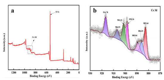 Figure 3 displays the XPS full spectrum and Ce 3d spectrum of CeOx/Kaol material. As shown in the Figure 3a, the characteristic peaks for Ce 3d were observed in the XPS full spectrum CeOx/Kaol material, which indicated that the CeOx particles were successfully loaded on the surface of the Kaol. As shown in the Figure 3b, the Ce 3d spectrum binding energy were fitted by seven peaks approximately at 882.64 eV, 886.02 eV, 889.04 eV, 898.26 eV, 901.31 eV, 906.93 eV, and 916.70 eV [26]. The binding energy peaks at 882.64 eV, 889.04 eV, 898.26 eV, 901.31 eV, 906.93 eV, and 916.70 eV were assigned to the CeIV, and the binding energy peak at 886.02 eV was attributed to the CeIII [21,41]. The contents of CeIV and CeIII were calculated and determined as 88.63% and 11.37%, which indicated that CeIV was the most abundant cation in the bulk of CeOx loading on the Kaol.