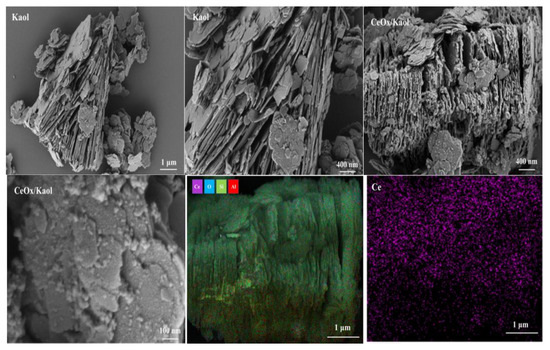 SEM images and EDS of Kaol and CeOx/Kaol material.
