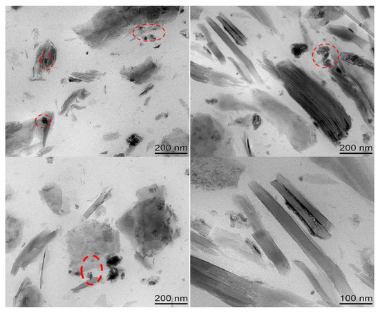 The SEM images of SBR composites filled with CeOx/Kaol material are shown in Figure 6. The CeOx/Kaol particles had a uniform and fine dispersion in the SBR matrix. There was no significant aggregation in the overall view. Meanwhile, the rubber chains interacted with CeOx/Kaol particles, and which were confined within the interparticle space of CeOx/Kaol particles. This could restrict the motion of rubber molecule chains and prevent the extension of the cracks when the resulting composite is stretched. Figure 7 shows the TEM images of SBR composites filled with CeOx/Kaol material. The CeOx/Kaol material with the layer-like particles exhibited significant characteristics with a diameter from 300 nm to 500 nm and a thickness from 50 nm to 200 nm. The average distances between the layer-like particles ranged from dozens of nanometers to hundreds of nanometers. As shown in Figure S2, the CeOx particles with a dozen nanometers were observed on the surface of Kaol and interacted with the rubber chains. Similar to previous works, the phenomenon of bent lamellar structures was observed, which may be due to mechanical action during processing of rubber composites.